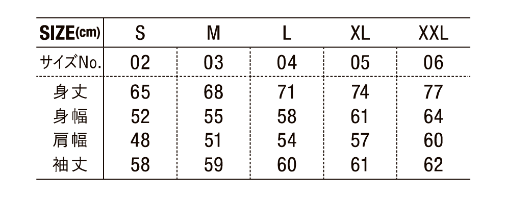 | 袖丈 | 58 | 59 | 60 | 61 | 62 |