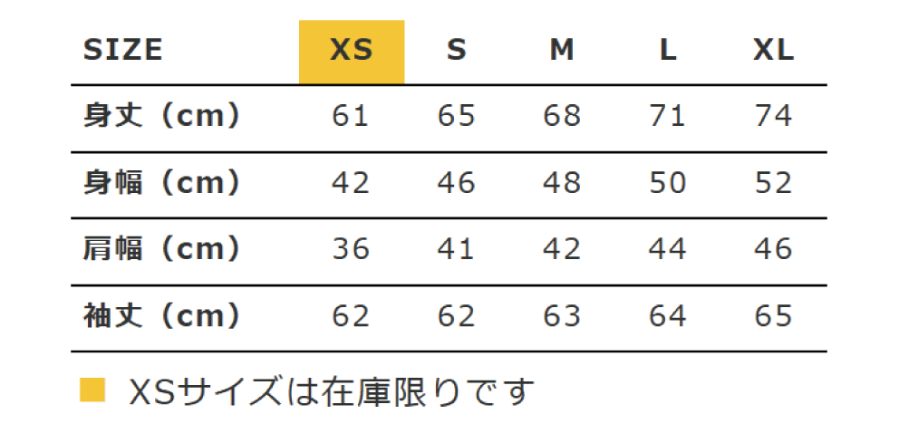 | 袖丈 | 62 | 62 | 63 | 64 | 65 |