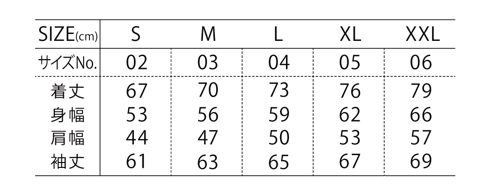 | 袖丈 | 61 | 63 | 65 | 67 | 69 |