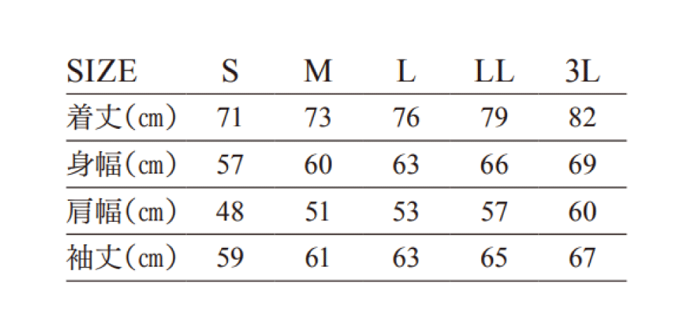 | 袖丈 | 59 | 61 | 63 | 65 | 67 |